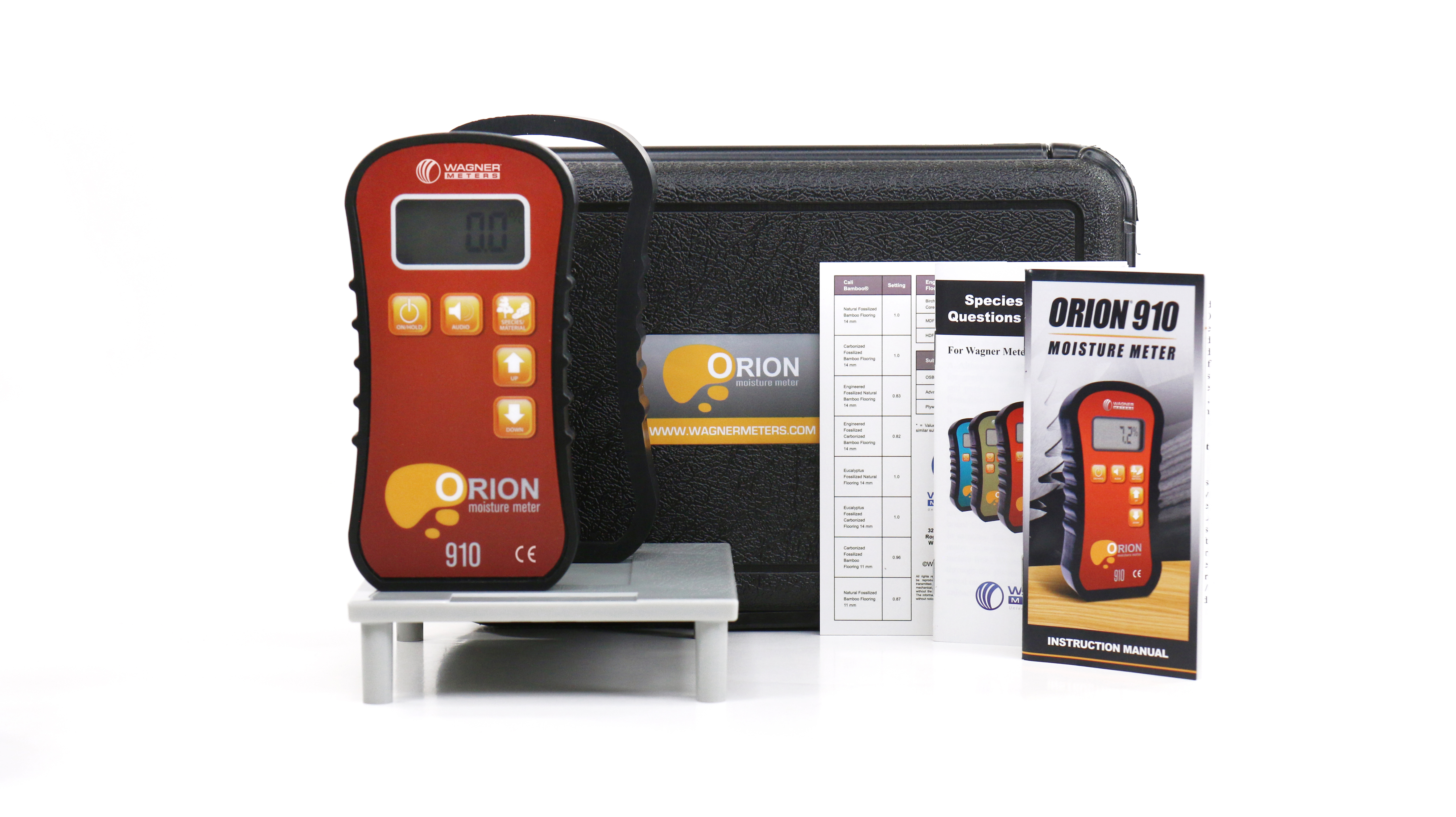 Grâce à de simples boutons fléchés haut/bas, votre appareil de mesure Orion peut être réglé facilement et rapidement en fonction des essences de bois que vous devez mesurer. De plus, la gamme de réglages s'adapte à pratiquement toutes les essences de bois tendre ou de bois dur du monde. L'Orion 910 peut également être configuré pour mesurer certains produits en bois non massif tels que le contreplaqué, l'OSB ou le MDF. Les appareils de mesure Orion disposent également de réglages d'essence pour de nombreux produits de revêtement de sol en bambou.
